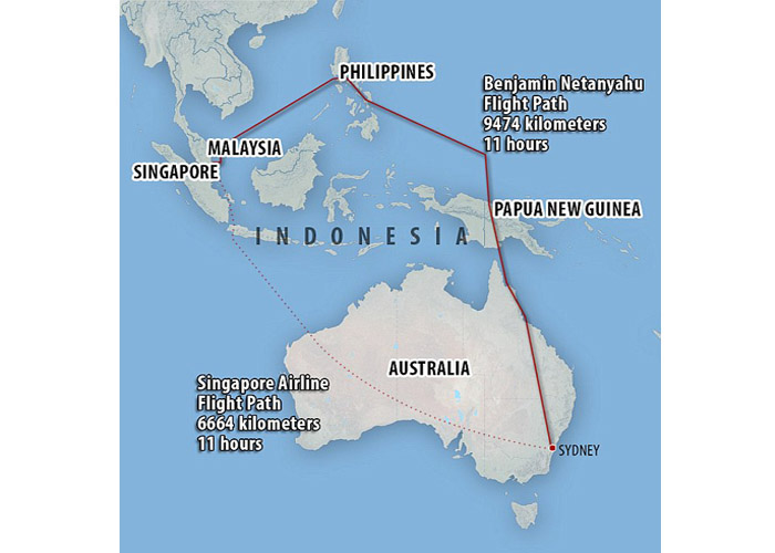 The average flight time between Singapore to Sydney is eight hours but the Israeli leader's aircraft had taken a longer route.