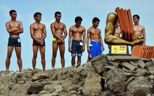Sebelum lomba para peserta melumuri tubuh mereka dengan minyak sebelum naik ke gundukan batu untuk memperlihatkan tubuh kekar mereka, musik mengiringi aksi mereka melenturkan otot diikuti sorak-sorai dari penonton di Jatiwangi, desa sekitar 200 km di timur Jakarta.