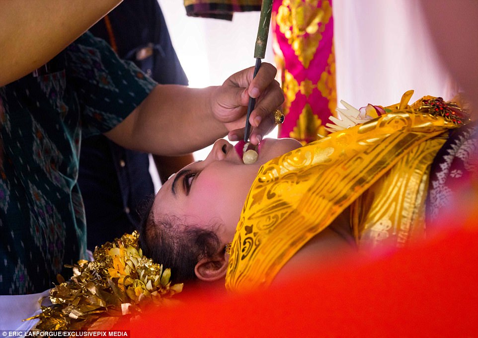 In a tradition that predates Hinduism's arrival on the island in the 5th Century BC, a priest then uses a metal file to grind down their canine teeth so the teenager, who must stay silent throughout, can become 'fully human.'