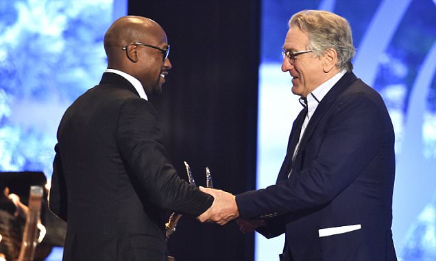 FLOYD MAYWEATHER honoured with 'The Best Ever' trophy by actor Robert De Niro during Spike TV's Guys Choice awards 2015.
