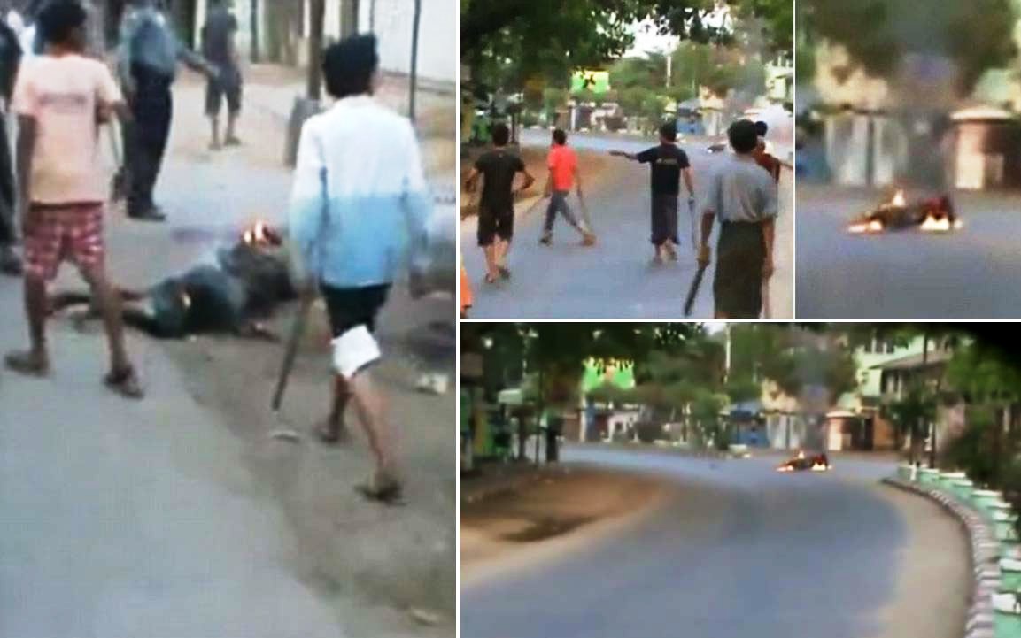 Dalam rekaman kasar yang di-posting di internet - tampak warga Muslim - terlihat berguling-guling di tanah kesakitan setelah dibakar oleh massa yang marah.