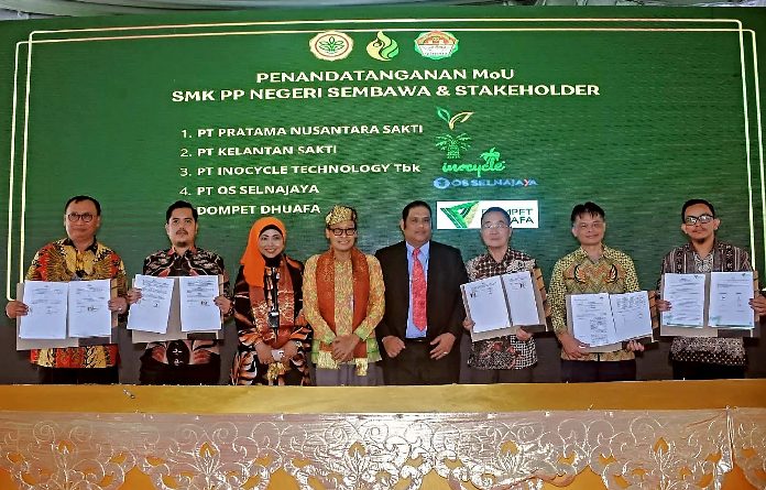 Kepala SMK PP Negeri Sembawa Yudi Astoni bersama-sama dengan Direktur PT Pratama Nusantara Sakti, Isman Hariyanto; General Manager PT Kelantan Sakti, Juniansyah Sinaga, General Manager PT Inocycle Technology Group Tbk, Jong Ho Park, Direktur PT OS Selnajaya Indonesia, Imron Munfaat: pimpinan Cabang Dompet Dhuafa Sumsel, Rizki Asmuni menandatangani MoU dan prjanjian kerjasama dalam bidang peningkatan pendidikan vokasi pertanian.