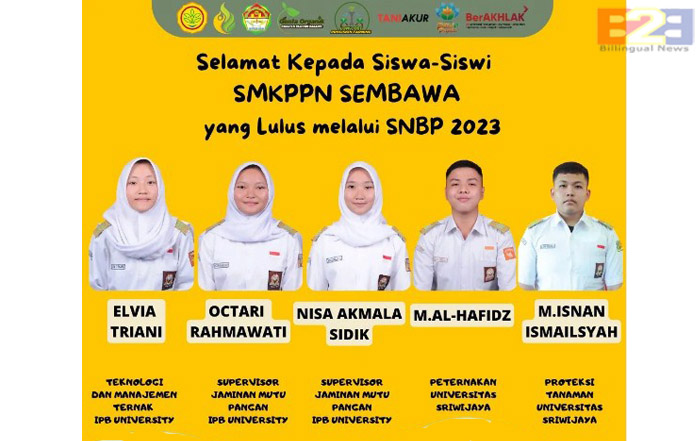 Banyuasin, Sumsel [B2B] - Lima siswa/i dari sekolah vokasi pertanian binaan Kementerian Pertanian RI yakni Sekolah Menengah Kejuruan Pembangunan Pertanian Negeri [SMKPPN Sembawa] menembus perguruan tinggi negeri [PTN] terkemuka di Indonesia, Institut Pertanian Bogor [IPB University] di Bogor dan Universitas Sriwijaya di Palembang [Unsri] melalui Seleksi Nasional Berdasarkan Prestasi [SNPB] Perguruan Tinggi Negeri [PTN].